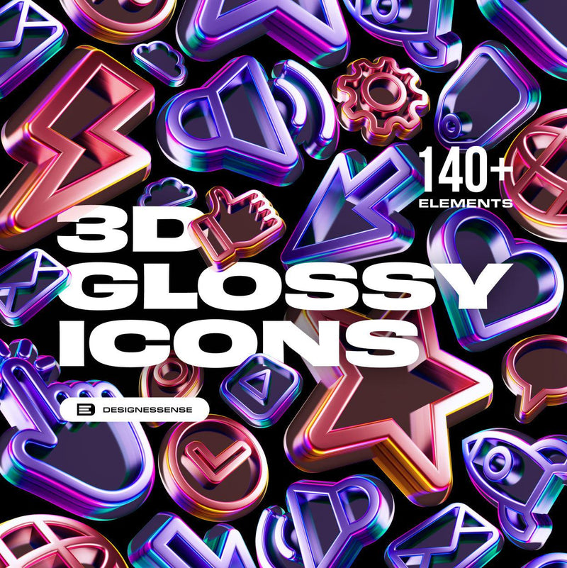 The 3D Glossy Icons set includes 144 high-quality, transparent PNG files suitable for various creative projects. These icons, available in two versions of 72 unique shapes each, can have their colors easily modified in Photoshop, Affinity Photo, Procreate, or Canva.