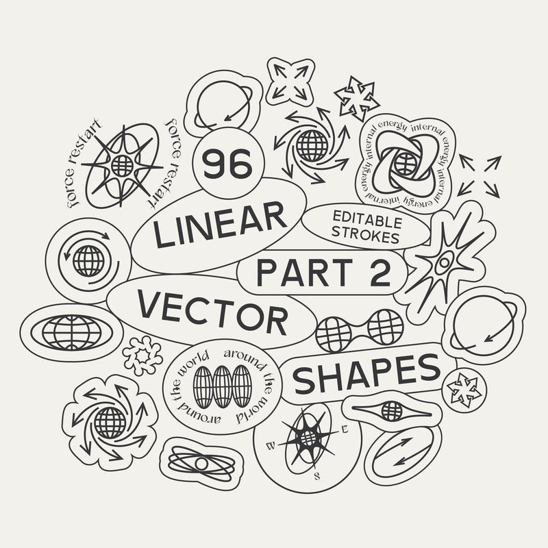 The "96 Linear Vector Shapes - Part 2" is a collection of 96 high-quality geometric shapes, including popular graphic elements like wireframe planets, arrows, vortex, stars, and other abstract shapes. The set allows for easy editing of stroke weights, transformation, and recoloring of each shape, and is compatible with various graphic editing software such as Illustrator, Photoshop, Affinity Designer, and more. The package includes AI, EPS, PDF, CSH, ABR, PSD,