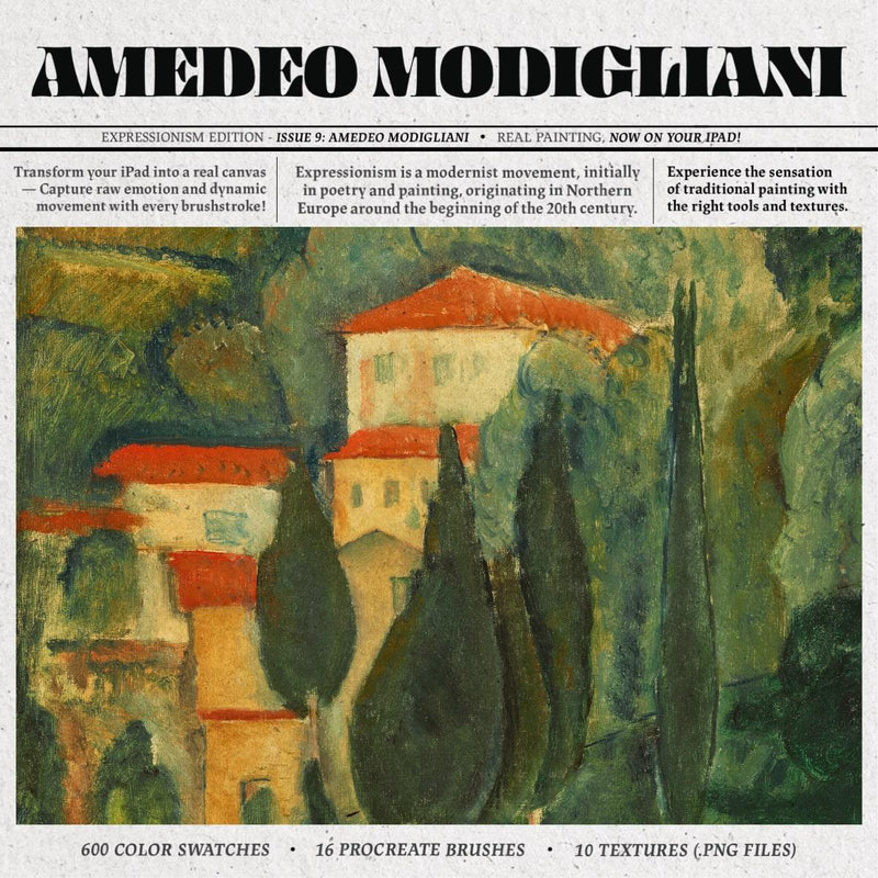 The Amedeo Modigliani Procreate Kit is a tool designed for illustrators and graphic designers, offering a range of resources inspired by the Expressionism movement. The kit includes 600 Procreate color swatches, 16 Procreate brushes, 10 textures, and offers free 24/7 support. This product requires an Apple iPad, Apple Pencil, and the Procreate App for iPad.