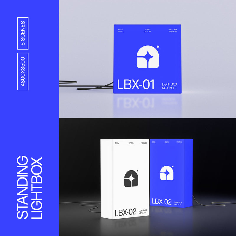 The Frameless Lightbox Signage Mockups collection includes twelve ultra-realistic PSD files featuring square and vertical lightboxes with cables, available in both light and dark modes. Each mockup is designed for easy customization using Smart Objects and offers adjustable lighting and color settings, with a resolution of 4800x3500px at 300 dpi. Compatible with Photoshop, this collection provides a clean, modern aesthetic for showcasing designs.
