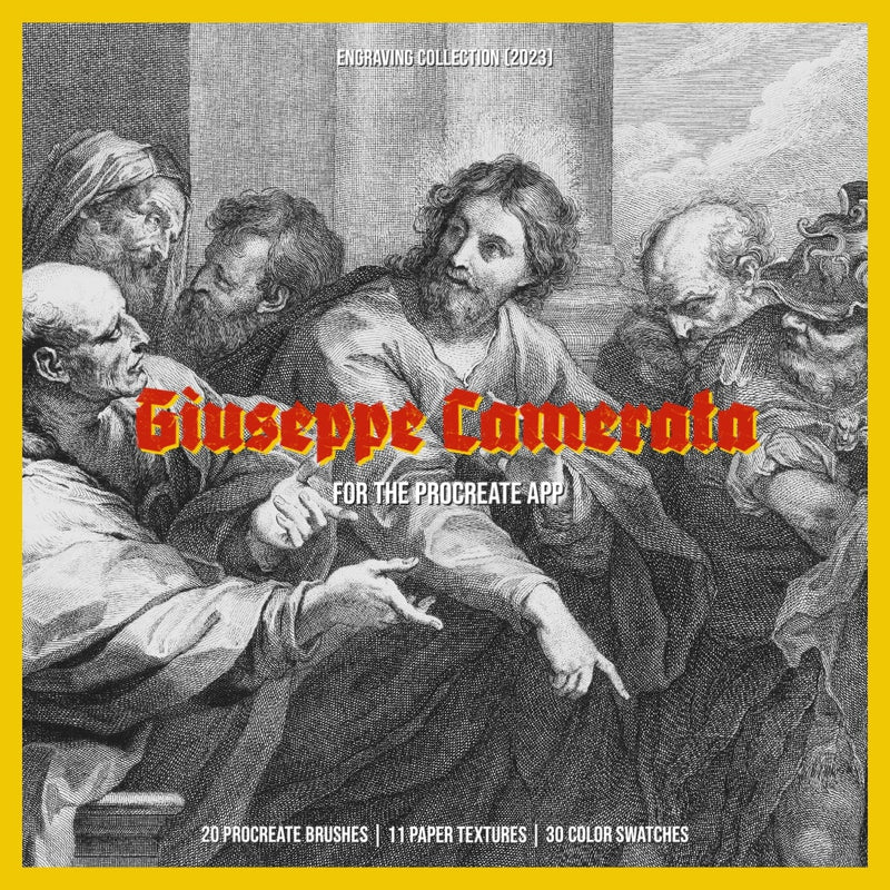 The Guiseppe Camerata Procreate Kit features twenty Procreate brushes, thirty color swatches, and eleven paper textures, inspired by the engravings of Italian miniaturist Guiseppe Camerata. This kit is designed for use with Procreate and includes a link to a curated Apple Music and Spotify playlist, along with 24/7 customer support.