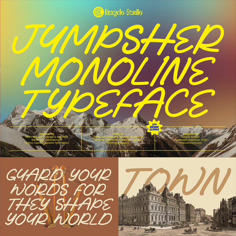 JUMPSHER is a sleek monoline handwritten typeface designed by Enxyclo Studio, featuring a smooth script with consistent stroke weight and a complete set of uppercase, lowercase, numerals, punctuation, symbols, and currency marks. It offers extensive multilingual support with 374 unique glyphs, ensuring readability and versatility for various print and digital applications.