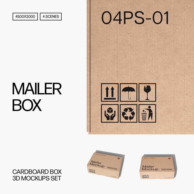 The Mailer Box Mockups Set includes 4 high-quality PSD files at 4500x3000 px and 300 dpi, featuring customizable box and background colors. Designed for use in Photoshop, this set allows users to easily showcase their designs by replacing the placeholder graphics in the Smart Object layer.