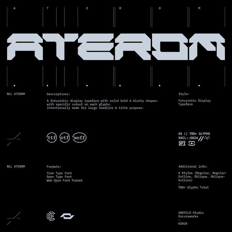 The NCL Aterom is a mecha cyberpunk display typeface that features bold, blocky shapes with unique cutouts on each glyph. It includes four styles (Regular, Regular Outline, Oblique, Oblique Outline) and supports over 780 glyphs including uppercase, lowercase, numerals, punctuation, and symbols. The font is available in True Type Font (TTF), Open Type Font (OTF), and Web Open Font Format (WOFF1 & WOFF2).