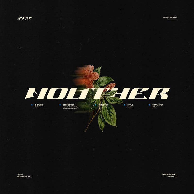 Nouther is a modern, bold-themed typeface with an italic touch, featuring unique shapes and a simplistic design. It is suitable for projects related to gaming, future tech, space travel, virtual reality, and more, and can be used for apparel, display, poster, and Y2K styles.