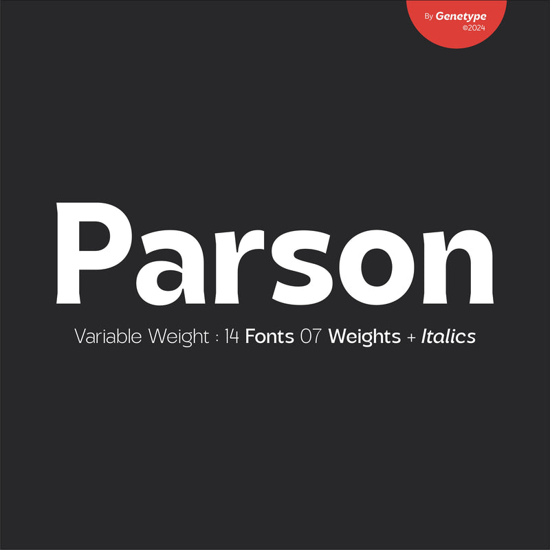 Parson is a modern humanist sans serif typeface family that includes 14 fonts (7 weights plus matching italics), designed for clarity and versatility. It features subtle curves and precise geometry, with a variable font version that allows for dynamic weight adjustments, ensuring excellent readability in both print and digital formats.