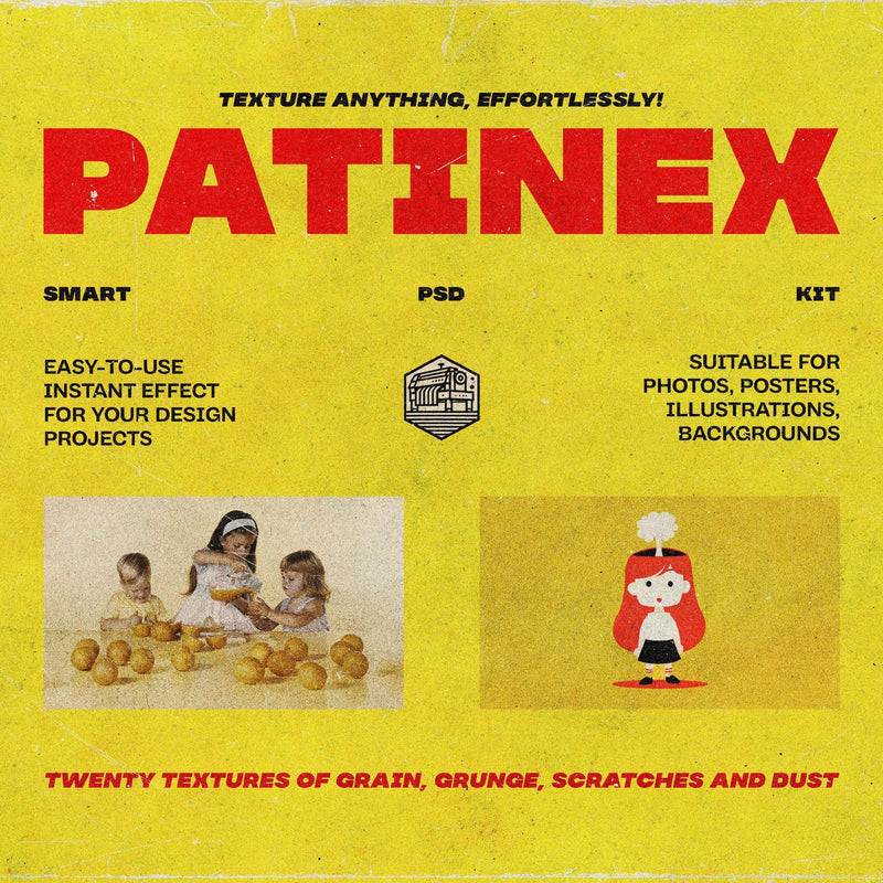 The Patinex Smart Texturing Kit is a Photoshop-compatible PSD kit designed to add retro textures to your artwork. It includes two PSD files (4500x3000 px and 3000x4500 px at 300 dpi) and features twenty textures such as dust, scratches, grunge, and grain, along with drag-and-drop functionality and adjustable blend modes and opacity controls.