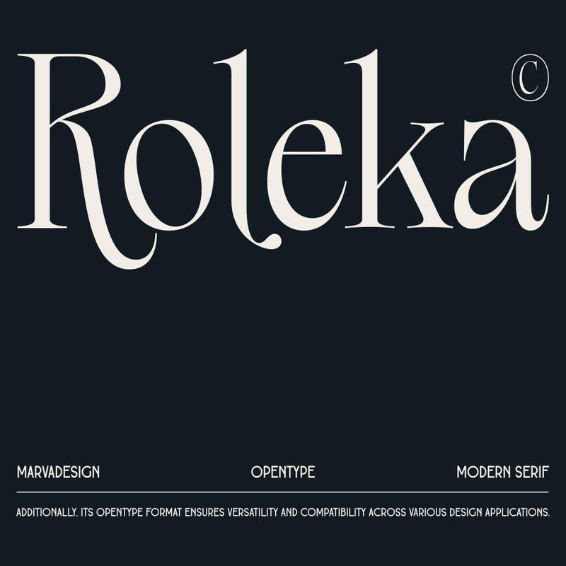 Roleka is a modern serif typeface characterized by high contrast between thick and thin strokes, elongated serifs, and smooth curves, offering a refined and sophisticated aesthetic. Its design combines classic and contemporary elements, making it suitable for various applications in branding and editorial design.