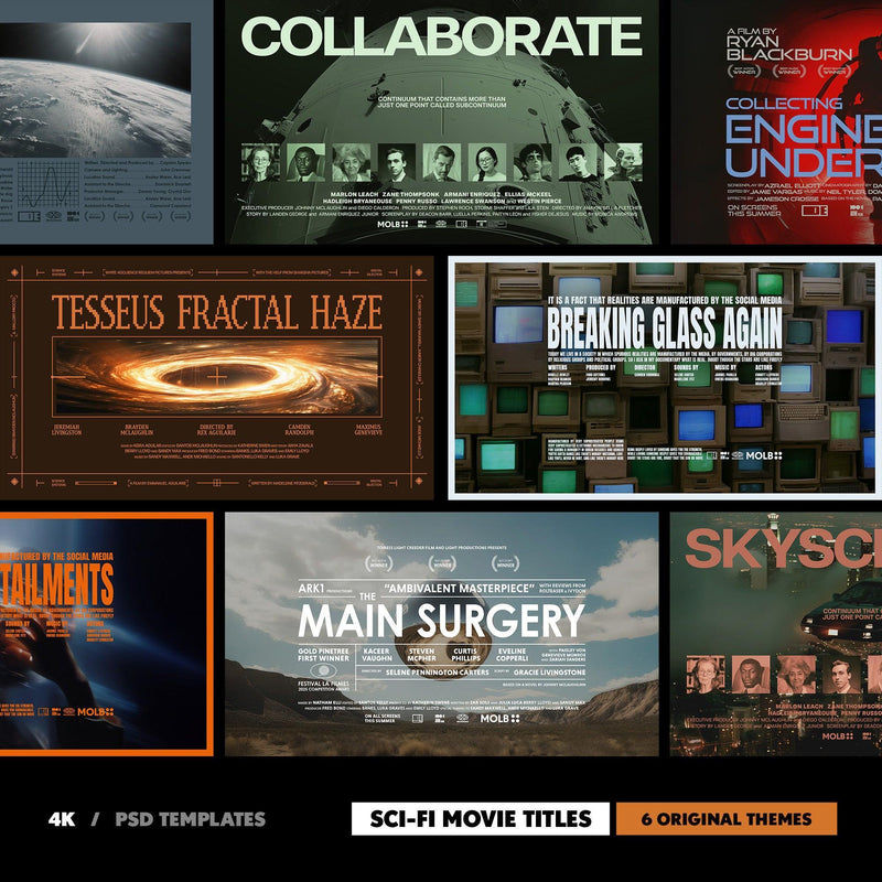 Sci-Fi Movie Titles is a collection of 6 high-quality PSD templates designed for film-inspired projects. Each template features a resolution of 3840x2160px at 300dpi, utilizes Adobe Fonts, and incorporates cinematic elements such as soft grain and distinctive typography, compatible with Photoshop.