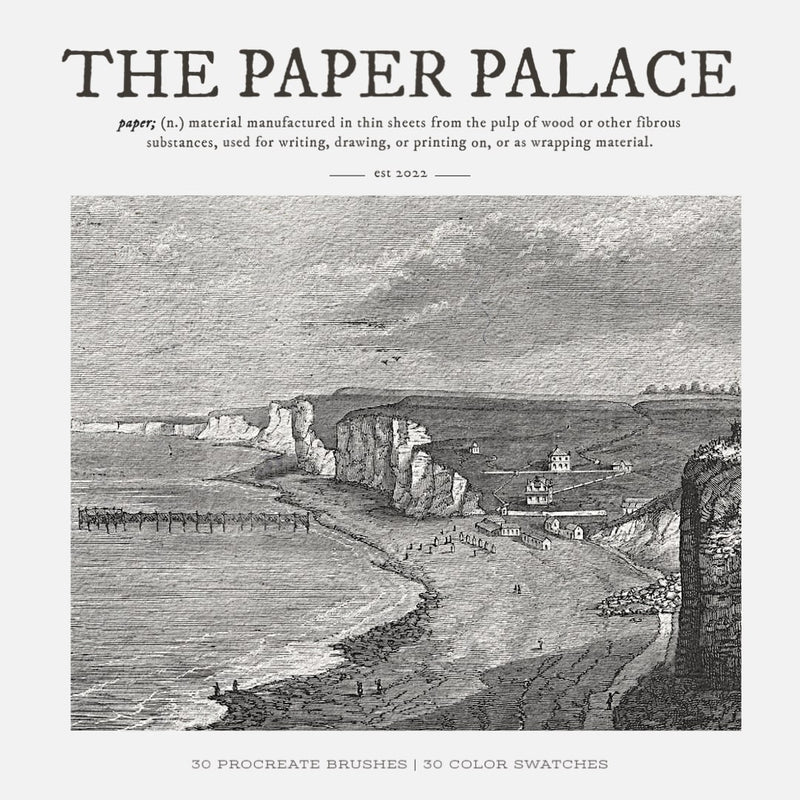 The Paper Palace Procreate Brushes include 30 color swatches and 30 texture brushes designed for the Procreate app, featuring realistic paper textures and vintage styles. This sustainable digital product aims to reduce paper waste while providing a comprehensive color palette and support available 24/7.
