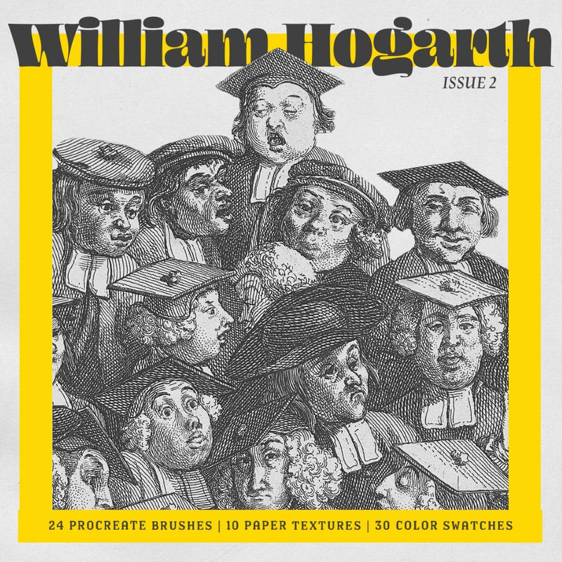 The William Hogarth Procreate Kit includes 24 Procreate brushes, 30 color swatches, and 10 paper textures designed to replicate traditional engraving techniques. Compatible with Procreate on iPad, this kit also provides a Spotify playlist link and 24/7 support for users.