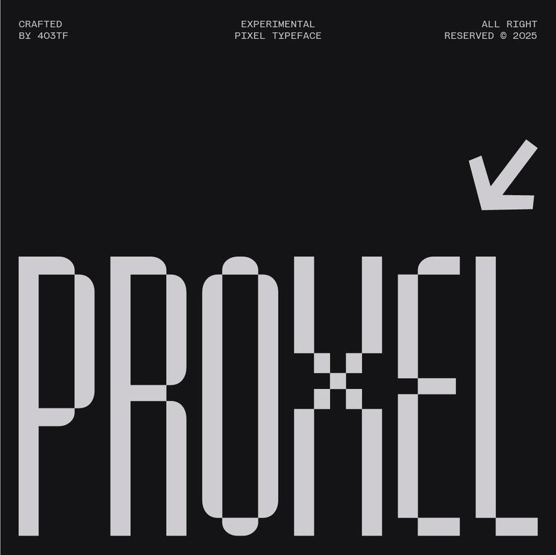 403 Proxel is a condensed sans-serif typeface characterized by its bold geometric design, tall narrow shapes, and sharp angles. It features slanted italics for added dynamism and rounded square terminals, making it suitable for high-impact display applications while supporting multilingual characters.