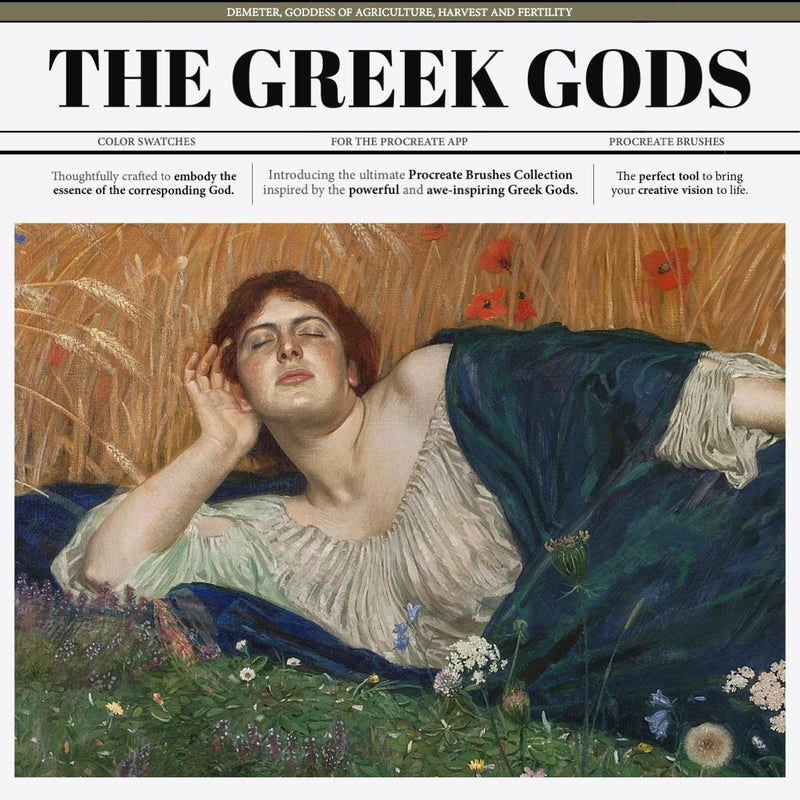 The Demeter Procreate Kit from The Greek Gods Collection includes 300 color swatches, 11 Procreate brushes, and 8 paper textures, all inspired by Demeter, the Goddess of the harvest and agriculture. This kit is compatible with Procreate and offers 24/7 free support.