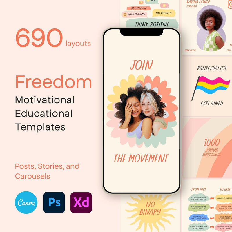 The Freedom Social Media Kit is a collection of online templates designed for spreading awareness through words and images on social media platforms. It includes 210 square posts, 210 vertical posts, 210 vertical stories, 30 posts combined into 5 seamless carousels, and over 500 SVG elements that can be customized in color. The kit is compatible with Canva, Adobe XD, and Photoshop, and comes with helpful documentation for customization.