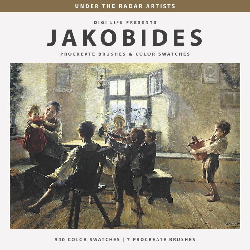 The Georgios Jakobides Procreate Kit includes 540 color swatches and 7 brushes specifically designed for Procreate, aimed at illustrators and graphic designers. It also features a Spotify playlist link and 24/7 free support for users.