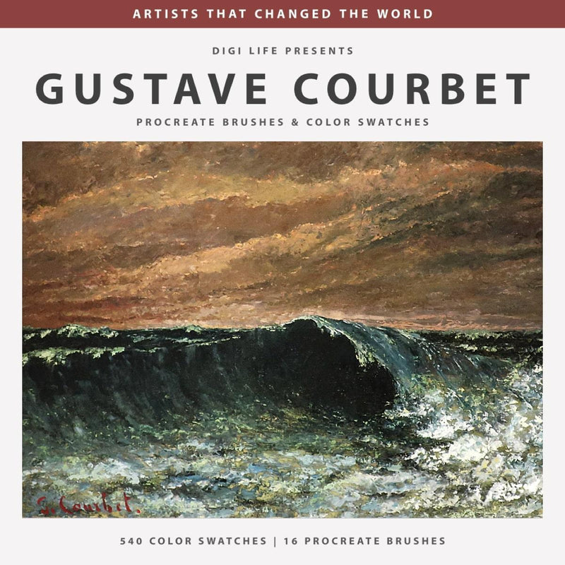 The Gustave Courbet Procreate Kit includes 540 color swatches and 16 brushes inspired by Gustave Courbet's paintings, designed for illustrators and graphic designers. It is compatible with Procreate and also provides a Spotify playlist link and 24/7 support.