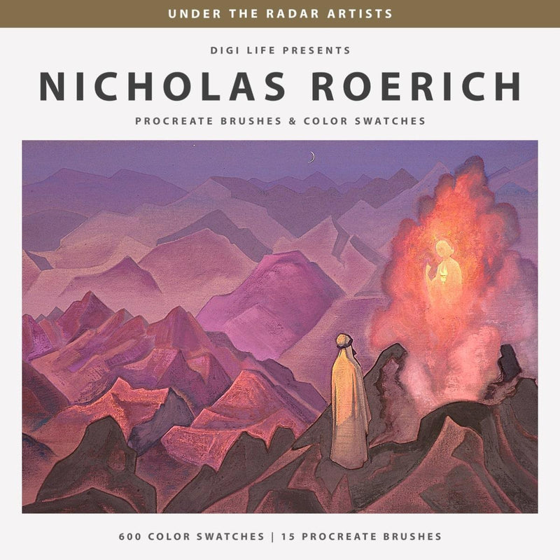 The Nicholas Roerich Procreate Kit includes 600 color swatches and 15 brushes specifically designed for Procreate, inspired by Nicholas Roerich's paintings. It also features a Spotify playlist link for classical music and offers 24/7 free support.