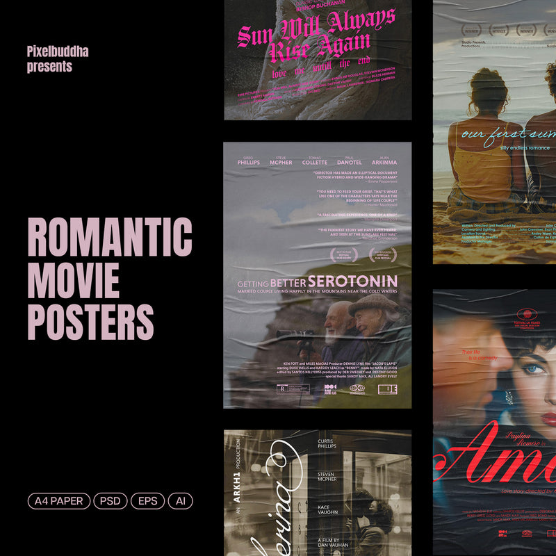 The Romantic Movie Posters Collection includes 6 fully editable A4 templates designed for film-related projects. Each template features layered typefaces, moody textures, and is available in PSD, AI, and EPS formats, with CMYK colors and a 4mm bleed for printing. Compatible with Photoshop and Illustrator.