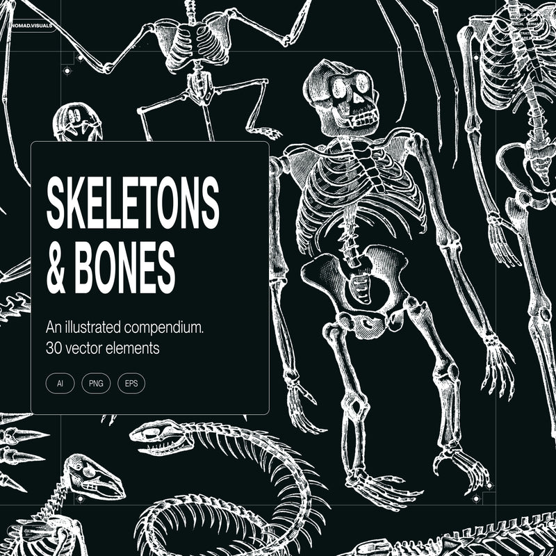 Skeletons & Bones features a collection of 30 antique illustrations of animal and human skeletons, restored from a vintage book. The illustrations are available in PNG, SVG, EPS, and AI formats, ensuring compatibility with Photoshop, Illustrator, Procreate, and Canva.