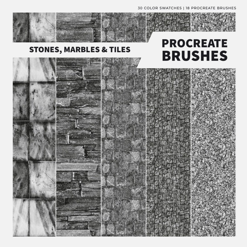 The Stones, Marbles & Tiles Procreate Kit includes 30 color swatches and 18 seamless texture brushes designed for Procreate, compatible with both iPad and iPhone. This kit provides a variety of stone, marble, and tile textures to streamline the digital drawing process for illustrators and graphic designers.