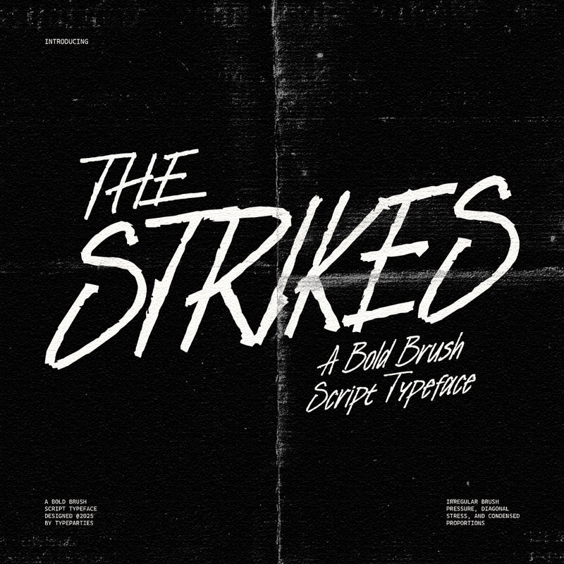 Strikes is a handwritten brush font featuring uppercase and lowercase letters, numerics, punctuation, and multilingual support. Available in both .otf and .ttf formats, it is characterized by rough brush strokes and a gritty texture, designed to create impactful typographic layouts.