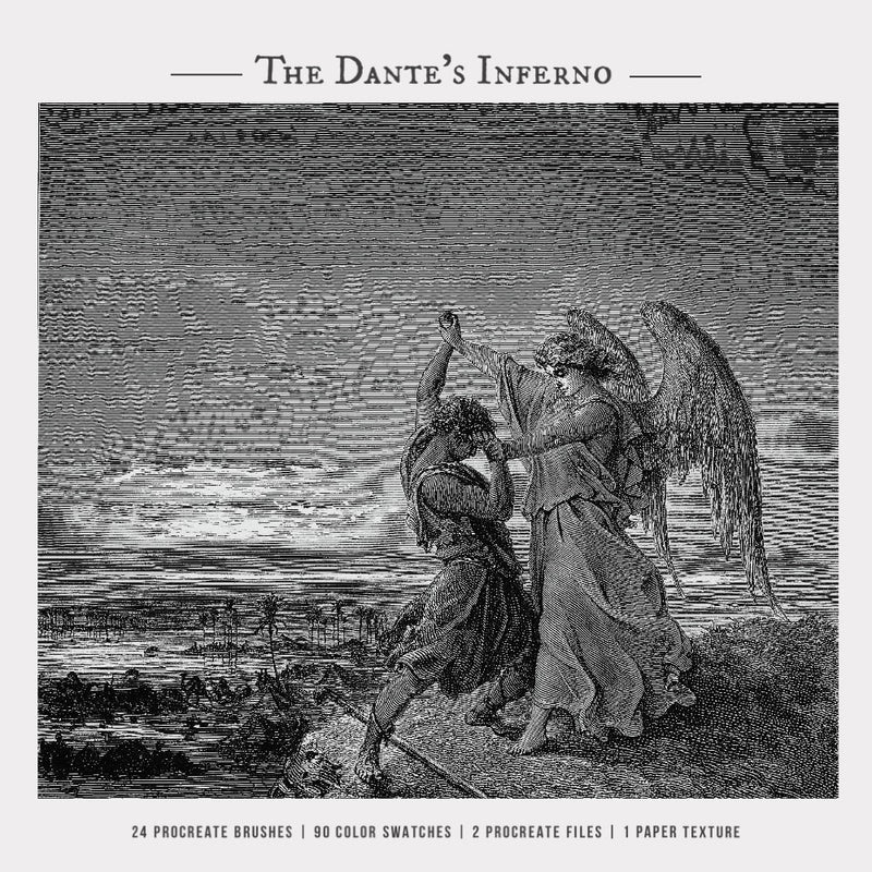 The Dante's Inferno Procreate Kit includes 24 Procreate brushes and 90 color swatches, inspired by Gustave Doré's artistic techniques. It also features a paper texture that replicates Doré's original work, along with customizable Procreate files and a Spotify playlist for an immersive sketching experience.