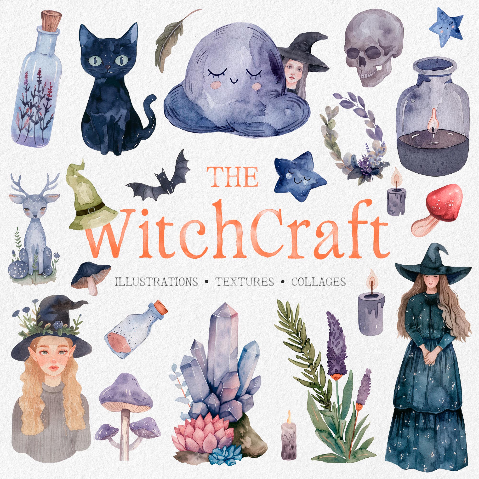 The Witchcraft: Watercolor Graphics Collection is a comprehensive pack of magical-themed graphics, featuring 267 PNG elements, 50 JPEG backgrounds, 5 premade scenes, and 4 paper textures. It includes a variety of elements such as witches, elves, mushrooms, potions, animals, crystals, and wreaths, compatible with Photoshop, Illustrator, After Effects, Affinity Designer, Affinity Photo, Indesign, Procreate, and Sketch.