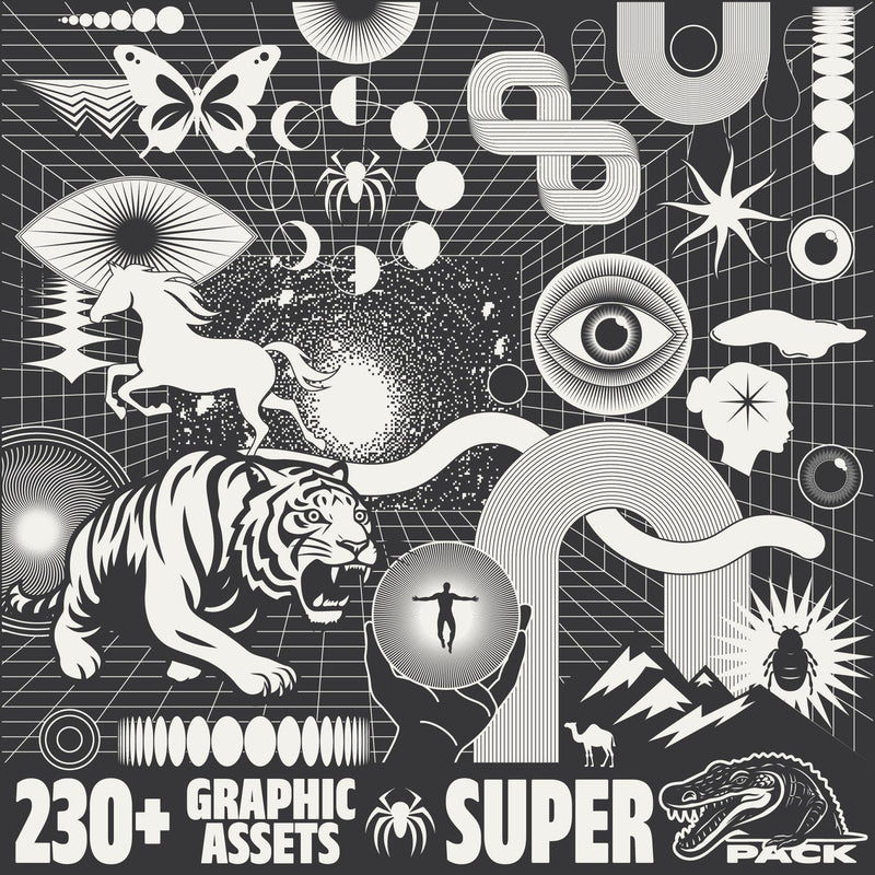 The 230+ Bold Graphics Super Pack is a modern collection of over 230 vector geometric graphic design elements in a simple linear style. The pack includes editable strokes and blend options for vector programs like Adobe Illustrator, and features abstract illustrations, jungle animals, minimal shapes, and transitions. It offers compatibility with various graphic editing software including Illustrator, Photoshop, Affinity Designer, and more.