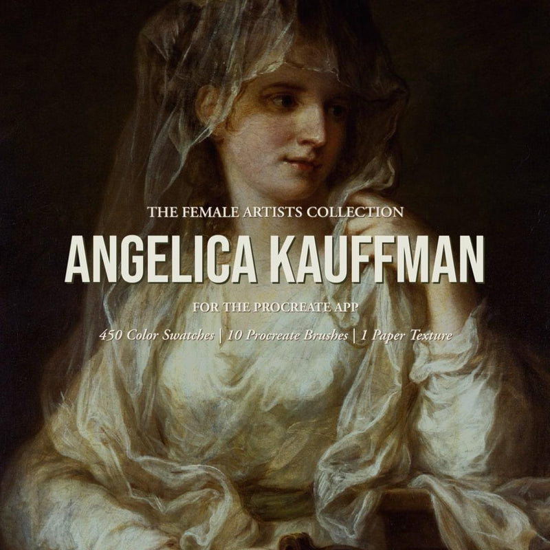 The Angelica Kauffman Procreate Kit includes 450 color swatches, 10 Procreate brushes, and 1 paper texture, all designed for illustrators, digital artists, and graphic designers. This kit is part of the Female Artists Collection and provides tools inspired by the color palettes of famous paintings, along with a Spotify playlist link and 24/7 support.