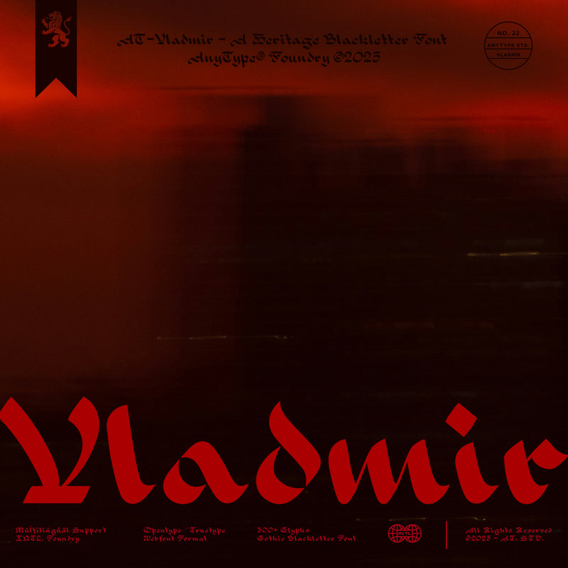 AT Vladmir is a bold Blackletter Heritage Font inspired by medieval scripts and gothic calligraphy, featuring over 300 glyphs and extensive multilingual support. This typeface includes refined OpenType features, providing a handcrafted feel while maintaining readability, making it suitable for various design applications.