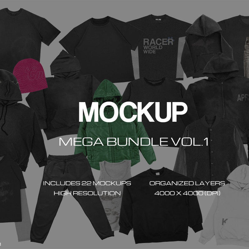 The Mockup Mega Bundle Vol.1 is a collection of 23 high-resolution (4K, 300 DPI) PSD files compatible with Photoshop. It offers a realistic garment mockup with adjustable colors for both front and back views.
