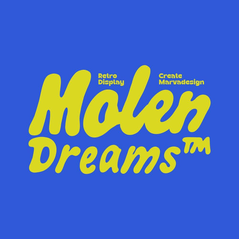 Molen Dream is a bold, retro-inspired display typeface featuring smooth, rounded edges and exaggerated curves. Available in multiple weights, it is suitable for branding, packaging, and posters, and offers stylistic sets for versatility across various design projects.