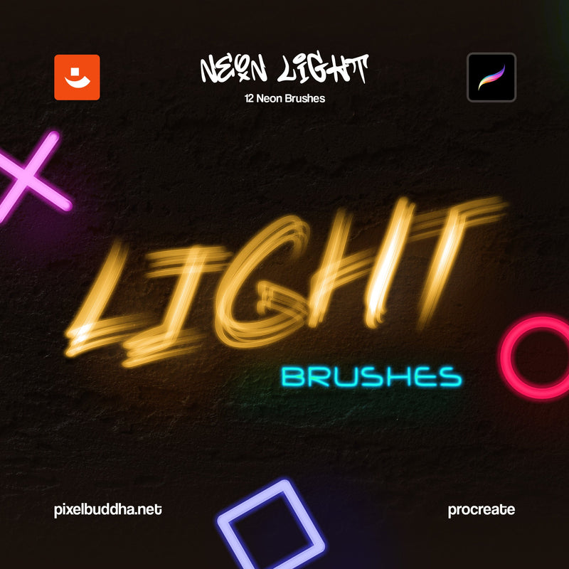 The Neon Light Procreate Brushes is a collection of 12 brushes designed for Procreate, featuring three round brushes that replicate classic neon tubes, bulb brushes for accents, and light brushes for highlights. The set also includes a premade color palette and an installation guide.