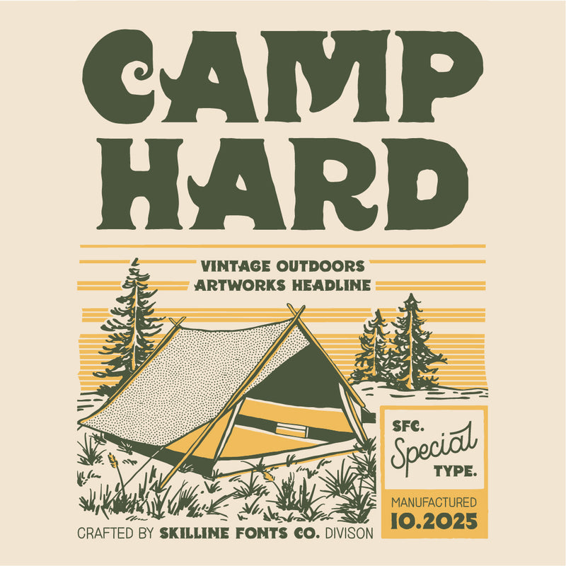 SFC Camphard is a bold vintage display font inspired by classic camping gear and outdoor adventure, featuring hand-rendered edges and rugged letterforms for enhanced legibility. This typeface combines strength and friendliness, making it suitable for various applications in outdoor branding and heritage-style projects.