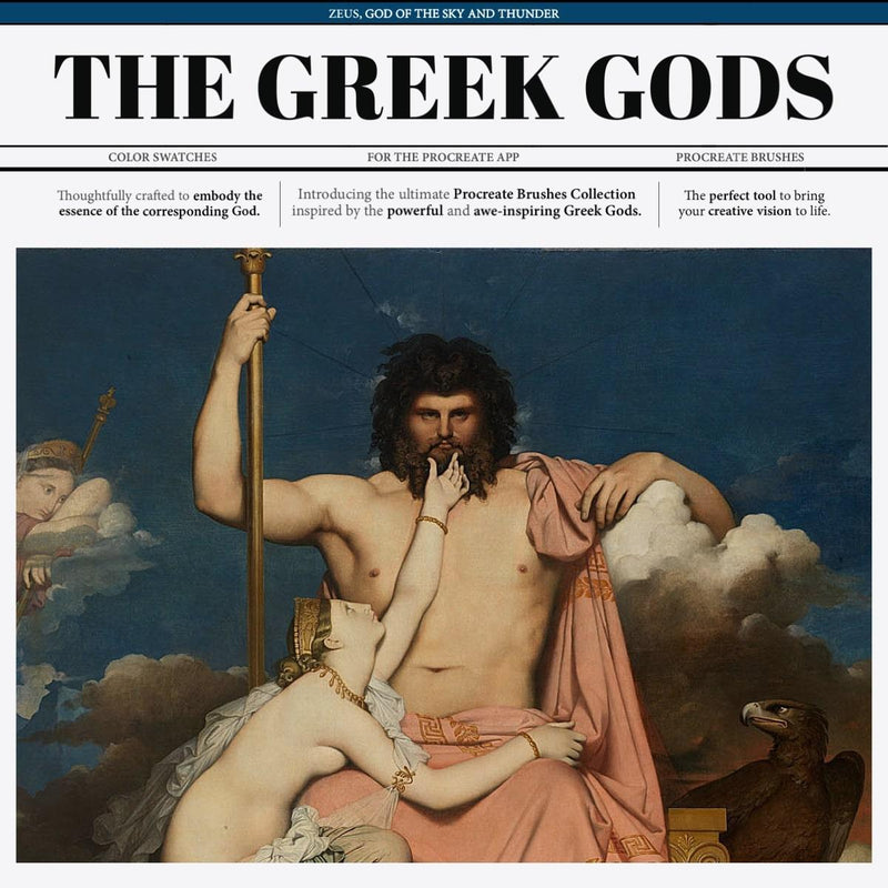The Zeus Procreate Kit from The Greek Gods Collection includes 150 color swatches, 11 Procreate brushes, and 1 paper texture, all inspired by Zeus, the God of the sky and thunder. This kit is compatible with Procreate and offers 24/7 free support.