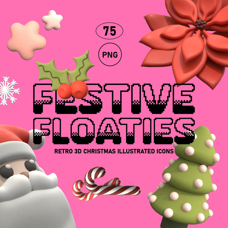 The 3D Retro Christmas Icons is a collection of 75 colourful, 3D rendered objects with a vintage holiday theme. Compatible with Photoshop, these icons are designed in the Hopecore trend, featuring cheerful colours and elements such as angels, wreaths, and baubles.