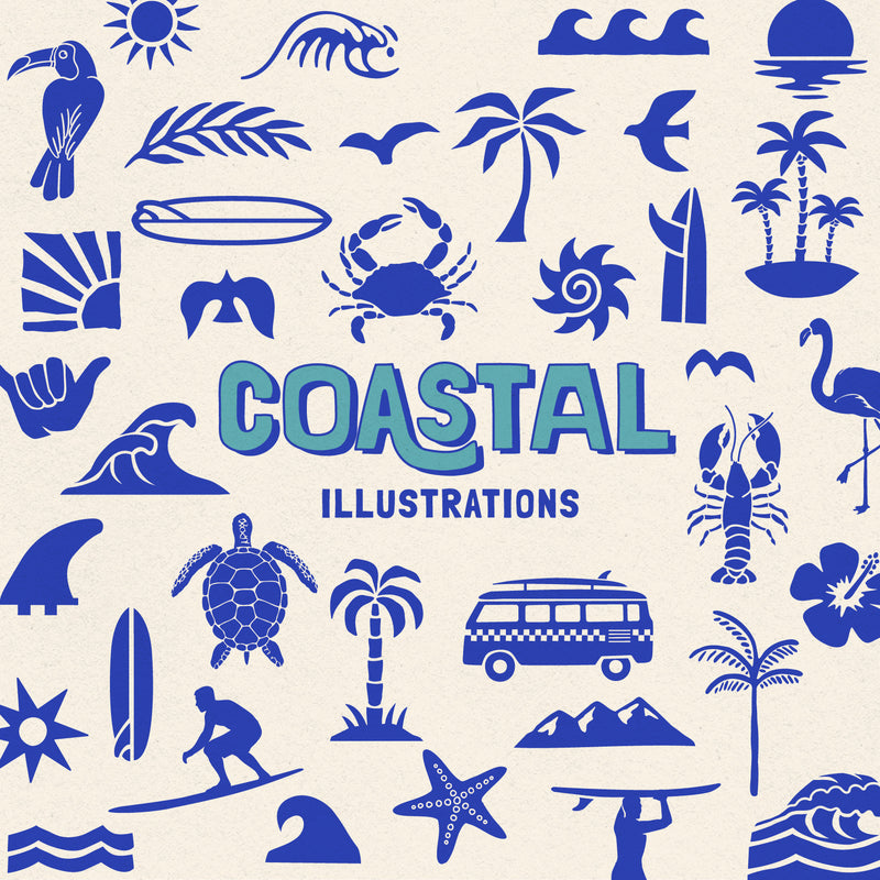 Coastal Illustrations is a vector set featuring 45 illustrations, including waves, palm trees, surfboards, and tropical animals, provided in AI and EPS formats, along with separately saved SVG and PNG files with transparent backgrounds. It is compatible with Illustrator, Photoshop, Affinity Designer, Figma, and Canva.