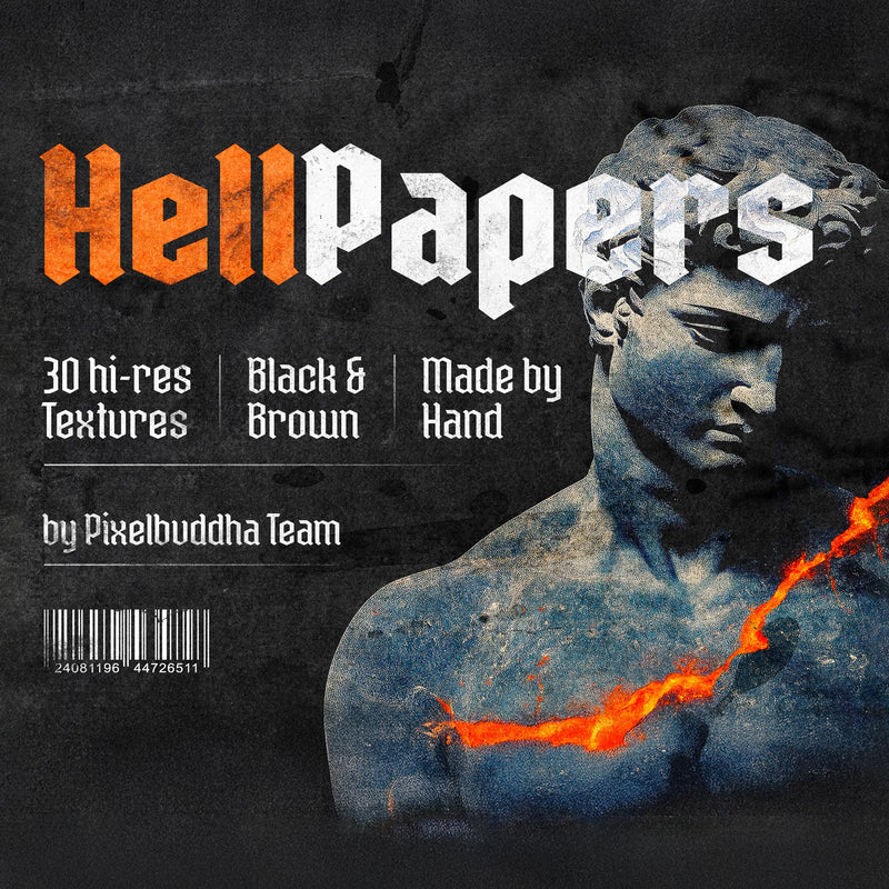 The Hell Paper: Grunge Textures Pack includes 30 original handcrafted textures, available in both brown and black & white, totaling 60 high-resolution JPG files (4500x3000 px, 300 dpi). Designed for use in Photoshop, these textures feature a variety of aged and distressed appearances, ideal for adding a historical touch to your designs.