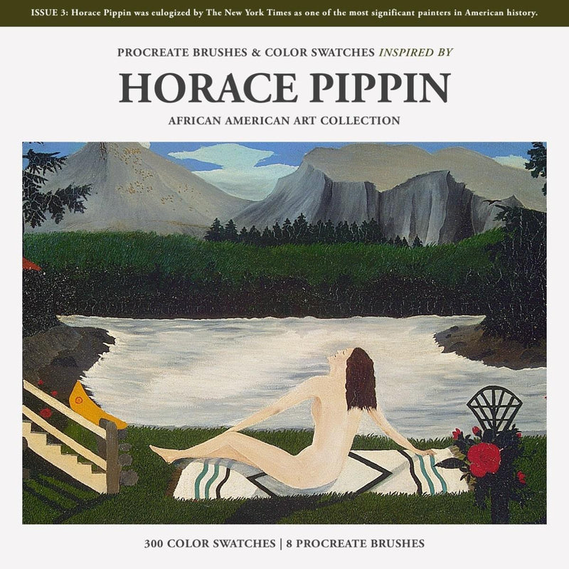 The Horace Pippin Procreate Brushes & Color Swatches are designed for illustrators and graphic designers, featuring 300 color swatches and 8 brushes inspired by Horace Pippin's paintings. This collection includes a Spotify playlist link and 24/7 support, and is compatible with Procreate.