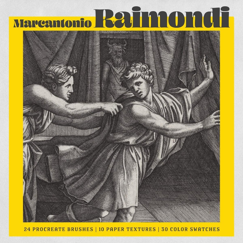 The Marcantonio Raimondi Procreate Kit includes 24 Procreate brushes, 30 color swatches, and 10 high-resolution paper textures, designed to replicate the aesthetic of traditional engraving techniques. Compatible with Procreate on iPad, this kit provides tools for sketching, inking, and shading, along with a Spotify playlist for an enhanced creative experience.
