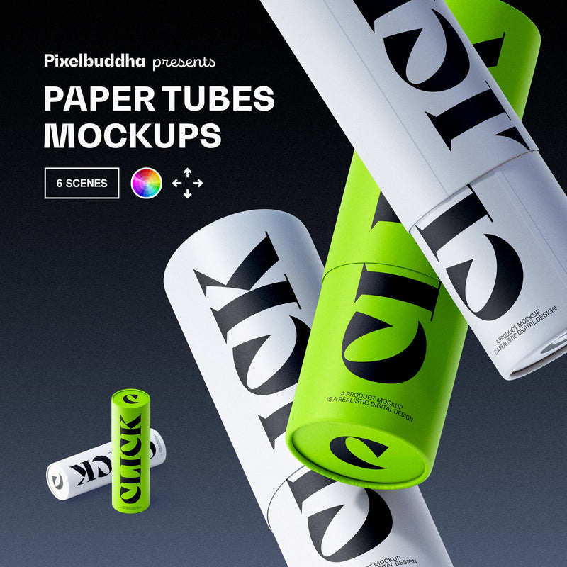The Paper Tube Mockup Set is a versatile packaging design tool compatible with Photoshop. It includes 6 high-quality PSD files with adjustable colors, backgrounds, shadows, and highlights, and features moveable isolated objects for customizable product presentation.