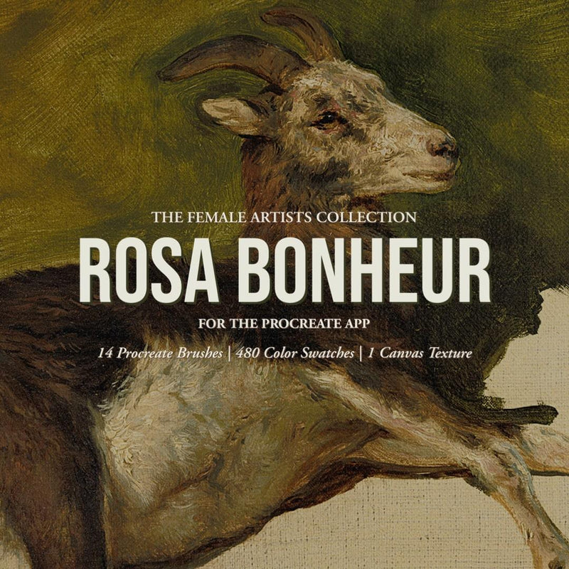 The Rosa Bonheur Procreate Kit includes 480 color swatches, 14 Procreate brushes, and 1 canvas texture, all designed for illustrators, digital artists, and graphic designers. This kit provides tools inspired by Rosa Bonheur's paintings to help users create cohesive color palettes and enhance their digital artwork.