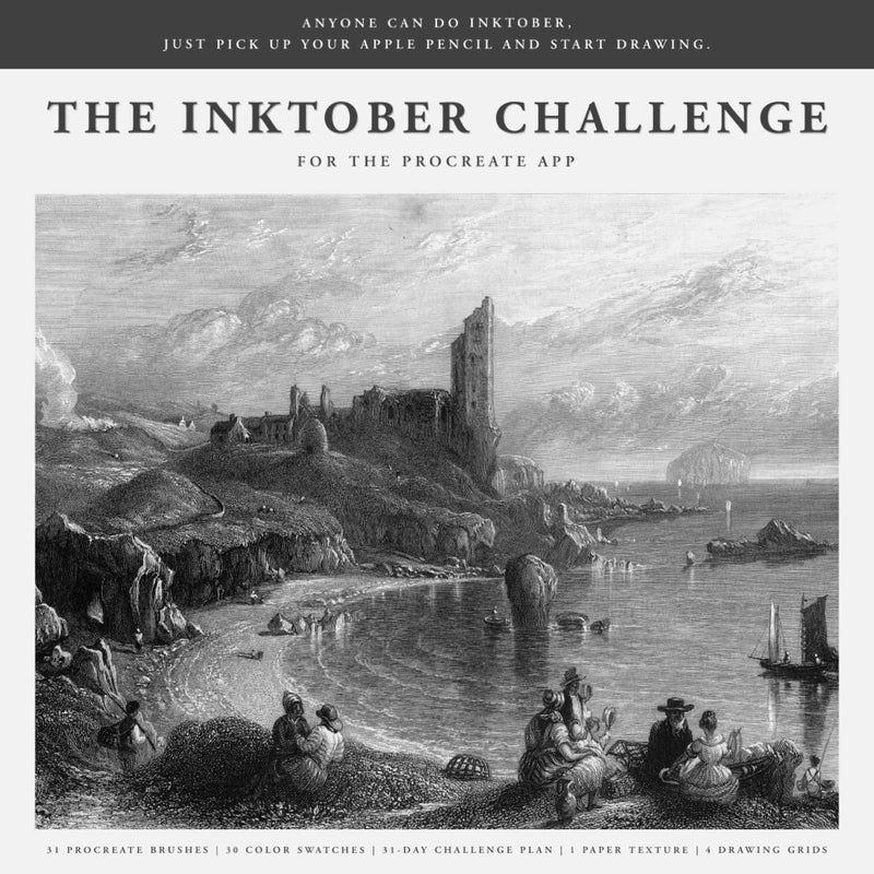 The Inktober Challenge Procreate Kit (2023) is designed for participants of the Inktober art challenge, providing essential tools to enhance their drawing experience. It includes 30 Procreate color swatches, 31 Procreate brushes, a paper texture, a Procreate file, a 31-day challenge plan, four drawing grids, and 24/7 support.