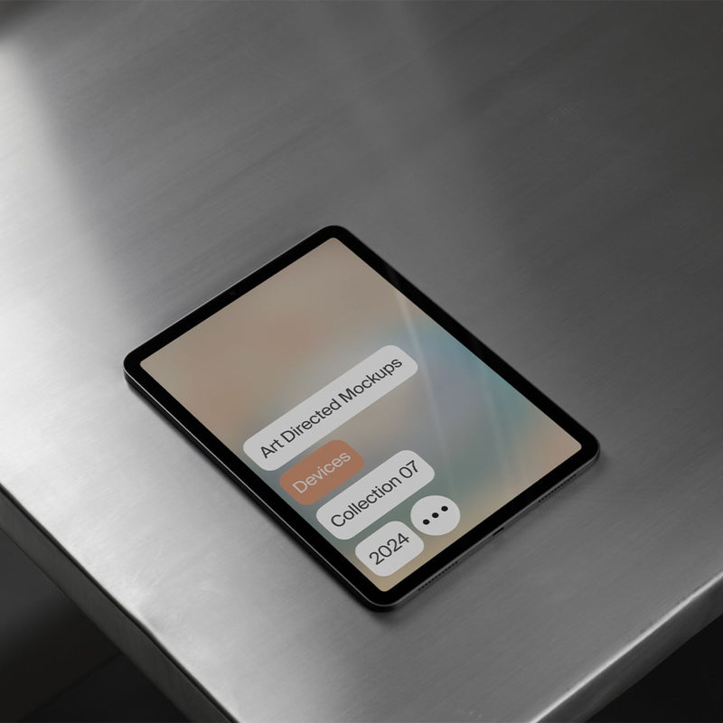The ARTD-C07-Ipad-014 is an 11" iPad Air mockup featuring adjustable reflections, designed for use with Photoshop. It is categorized under device mockups and is compatible with various design projects involving Apple products.