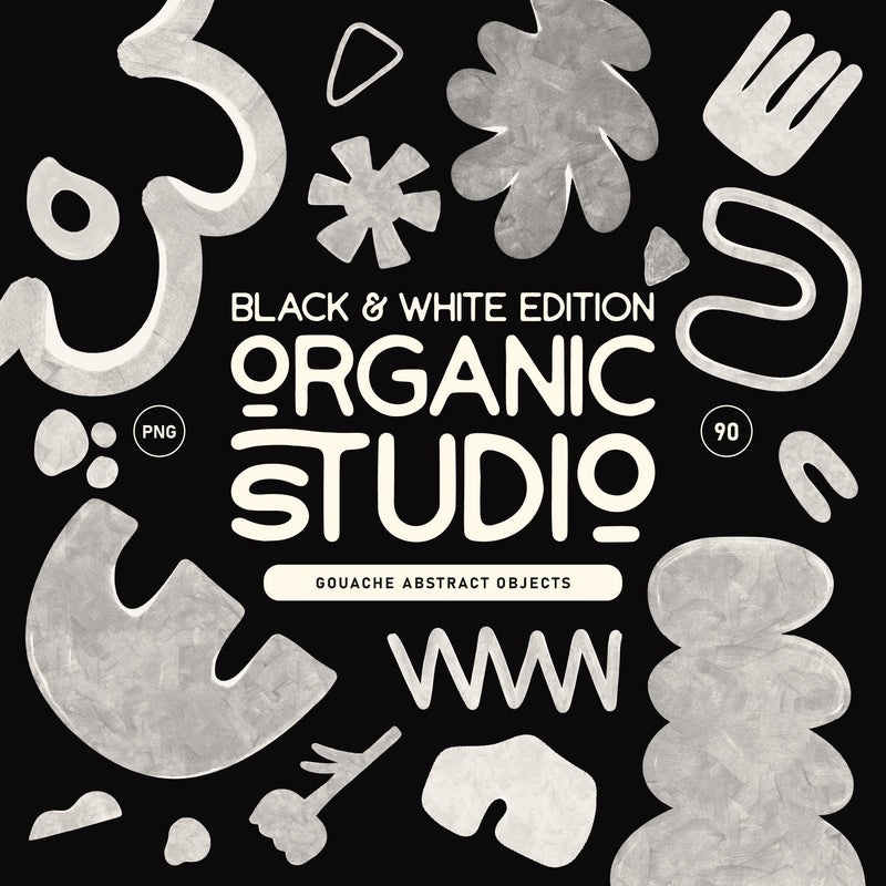 The Black&White Organic Abstract Studio is a collection of 90 abstract organic shapes in a minimalist black and white colour palette, available in PNG format. These shapes, which come in off black and off white tones, are compatible with Photoshop.