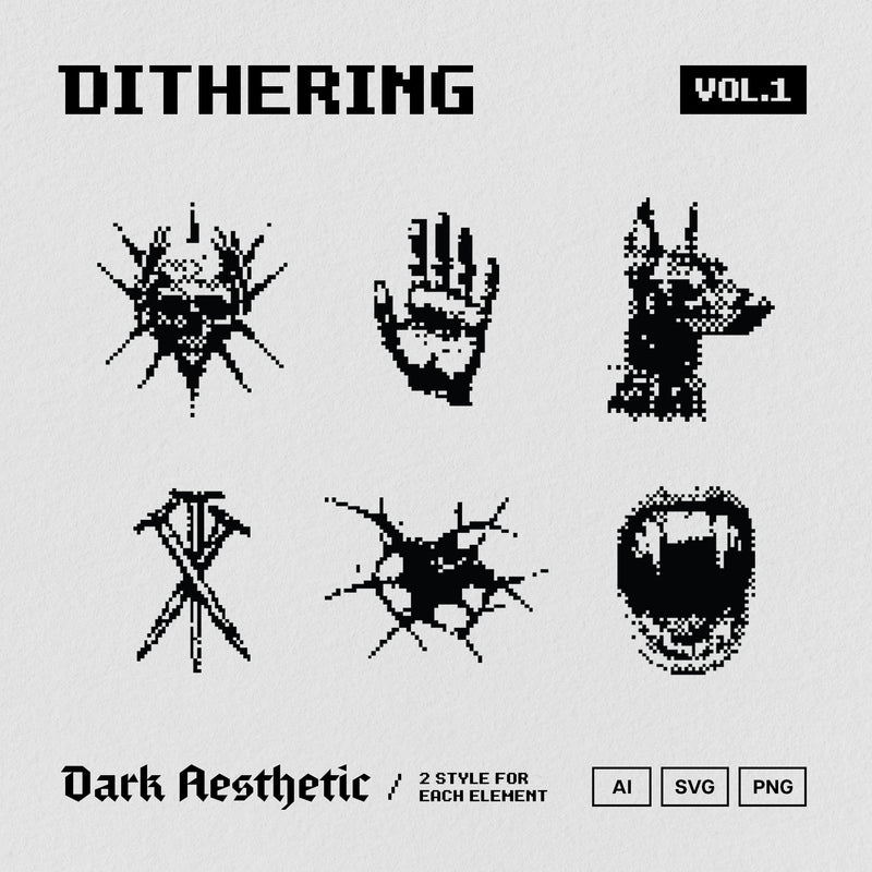The Dark Dithering Graphic Pack Vol.1 includes 48 PNG files with transparent backgrounds, 48 SVG vector files, and 48 AI vector files, offering compatibility with various design applications such as Adobe Photoshop, Illustrator, and Procreate. This collection features two style options and is suitable for a range of graphic design projects.