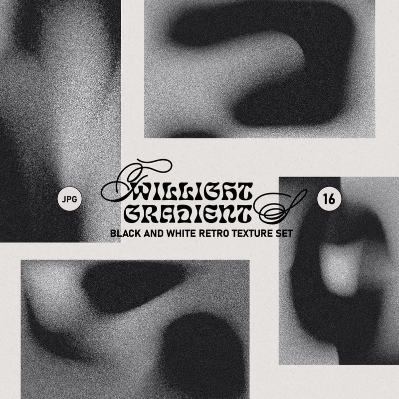 The Dark Retro Twilight Gradient Set is a collection of 16 gothic-inspired vector gradient textures, available in both high resolution (5000px) and web size (2000px). These grainy, black and white textures can be used for various applications including social media, packaging, and print products.