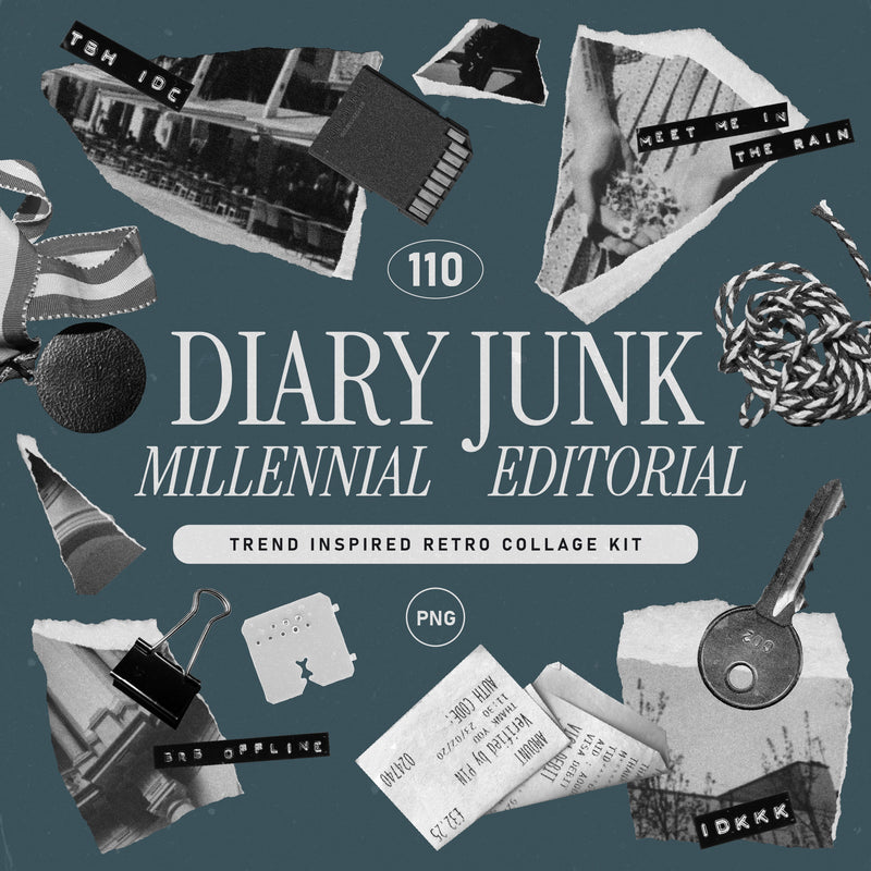 The MILLENNIAL JUNK Retro Collage Kit is a collection of 110 collage elements, including 49 handmade torn paper pieces, 34 retro embossed tags, and 27 black & white junk drawer items, all in PNG format with sizes ranging from 1000 to 4000 pixels. Designed for use in Photoshop, this kit offers a nostalgic aesthetic reminiscent of early 2000s culture, featuring grainy scans and retro fragments for creating layered collages.