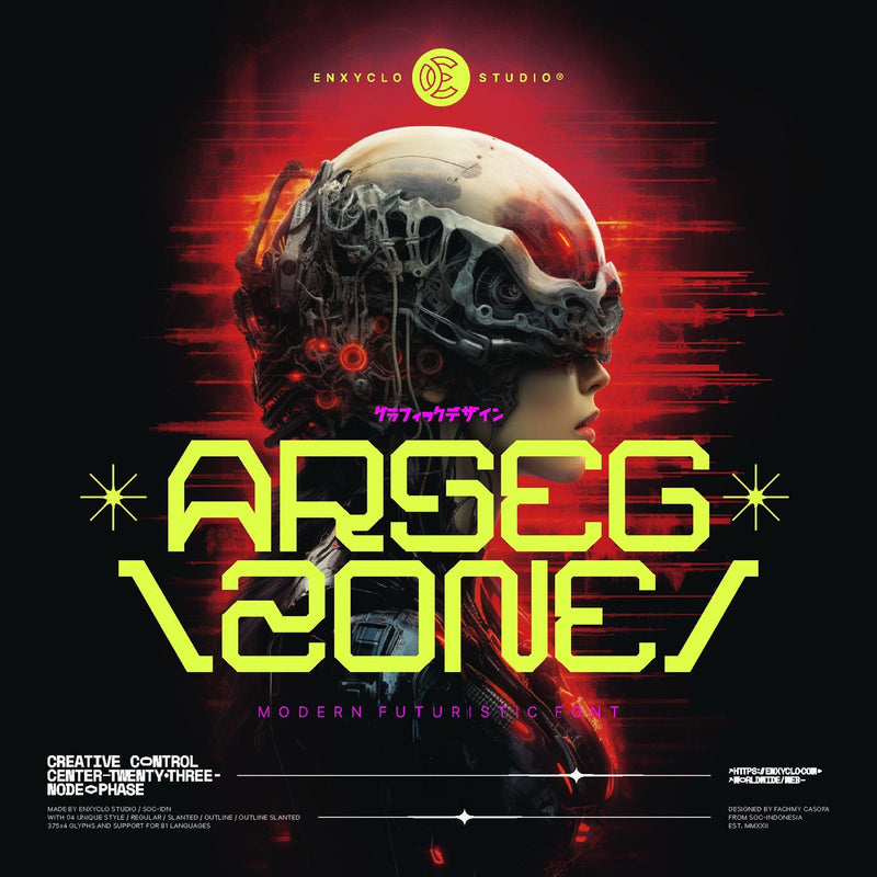 The NCL ARSEGZONE is a modern, futuristic font that includes four styles: Regular, Slanted, Outline, and Outline Slanted. It provides True Type Font (TTF), Open Type Font (OTF), and Web Open Font Format (WOFF1 & WOFF2), with a total of 1500 glyphs including uppercase, lowercase, numerals, punctuation, symbols, arrows, and stylistic sets. This font supports 81 languages.