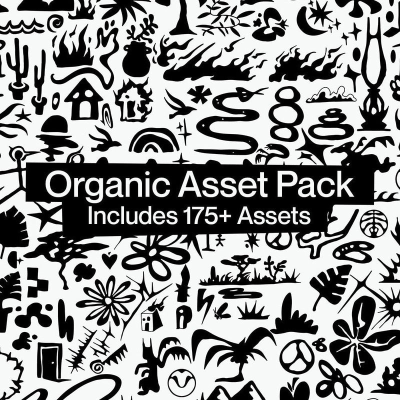 The Organic Asset Pack is a collection of over 175 hand-drawn icons featuring organic shapes and forms, available in both PNG and VECTOR formats. It is compatible with multiple platforms including Illustrator, Photoshop, Affinity Designer, Affinity Photo, Procreate, Sketch, Figma, and Canva.